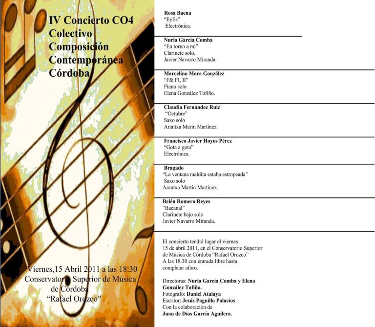 Concierto de estreno de obras de música contemporánea de nueva creación, realizado en el Conservatorio Superior de Música "Rafael Orozco" el día 15 de abril de 2011. Tuve el placer de participar como organizadora, junto con Nuria García Comba, y además como compositora e intérprete dentro del Colectivo de Composición Contemporánea de Córdoba (CO4).
