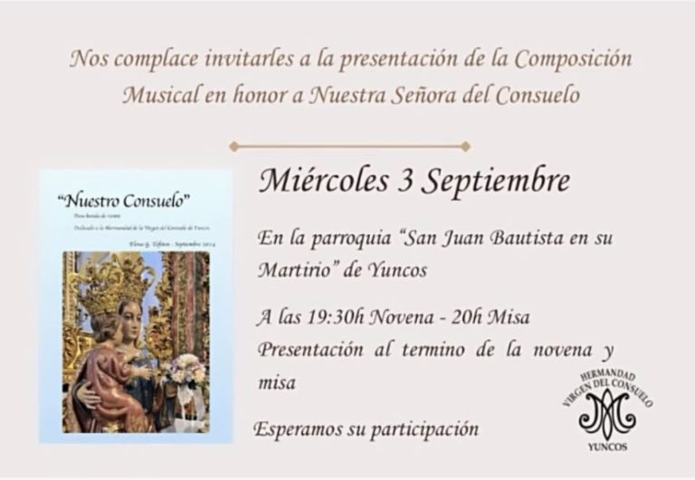 The presentation of my work "Nuestro Consuelo" took place on Wednesday, September 3, 2025, at the Church of Yuncos (Toledo). It is dedicated to the Brotherhood of Our Lady of Consolation of Yuncos and has become part of its cultural heritage.