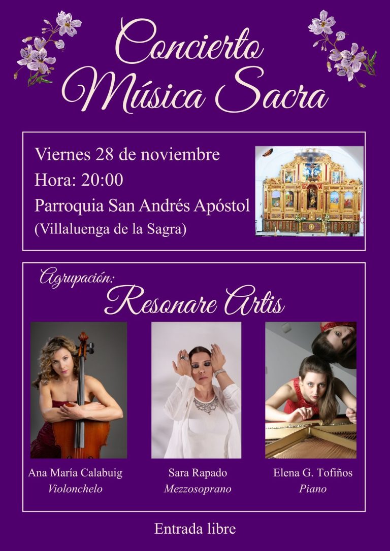 Concierto de música sacra a cargo de la Agrupación Camerística Resonare Artis, ofrecido en Villaluenga de la Sagra (Toledo) para conmemorar la festividad del patrón San Andrés. Tendrá lugar a las 20h en la Iglesia de la localidad, con entrada libre hasta completar aforo.
