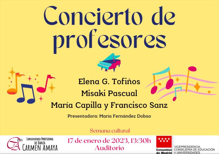 El día 17 de enero de 2023 se celebró un concierto pedagógico, a cargo de los profesores pianistas del Conservatorio Profesional de Danza Carmen Amaya. Tuve el placer de comenzarlo interpretando el Preludio y Fuga no14, en Fa # menor (BWV 859) de J.S.Bach, dando paso a otros grandes intérpretes.